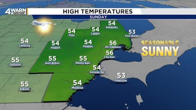 Metro Detroit se dirige vers une nuit froide avec des minimums entre le milieu et le milieu des années 30 pour la région : environ 35 degrés à l’aéroport métropolitain et environ 30 degrés à Ann Arbor et Sandusky. Les nuages diminueront et les vents seront légers et variables. Quiconque envisage de sortir tard doit se préparer à une nuit fraîche.